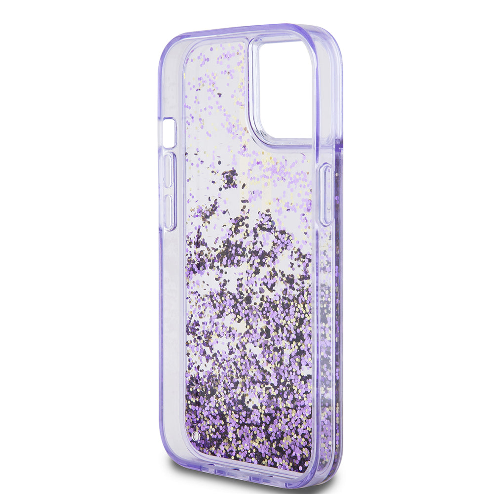 Apple iPhone 14 Kılıf Guess Orjinal Lisanslı Transparan Sıvılı Simli Altın Çizgili Kapak Mor