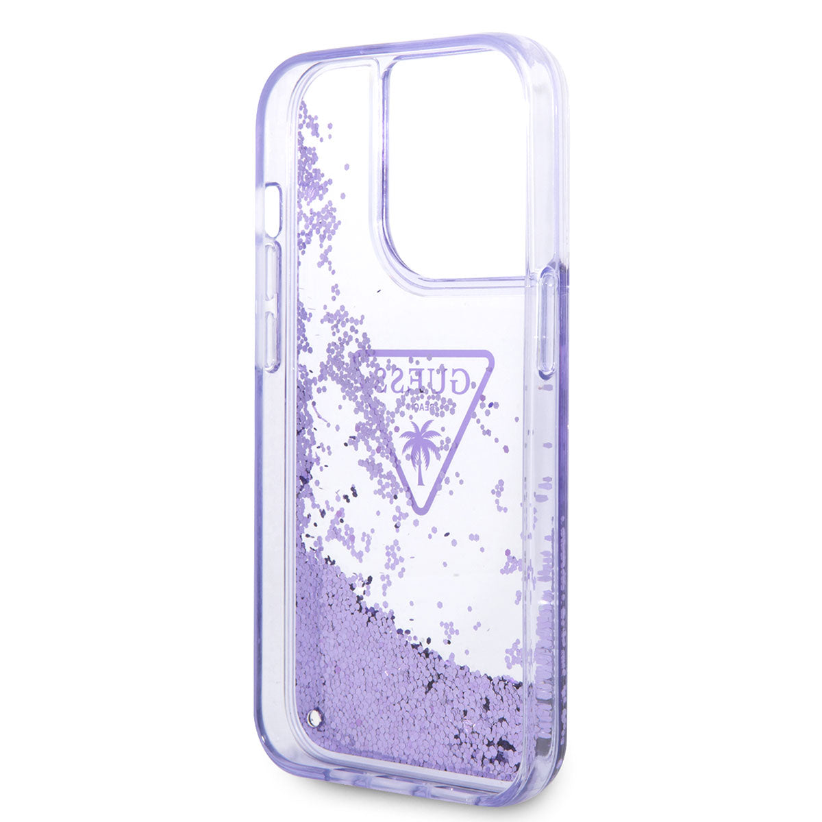 Apple iPhone 14 Pro Kılıf GUESS Transparan Sıvılı Simli Dizayn Kapak Mor