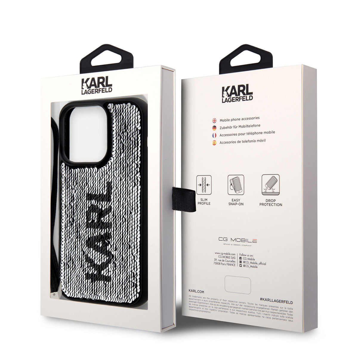 Apple iPhone 14 Pro Kılıf Karl Lagerfeld El Askısı İpli Hareketli Pullu Dizayn Kapak Siyah-Gümüş