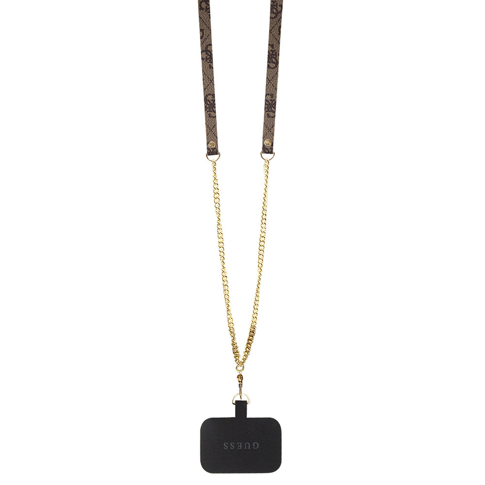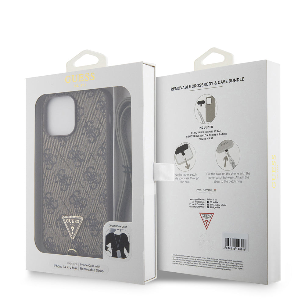 Apple iPhone 14 Pro Max Kılıf Guess Orjinal Lisanslı PU Deri Taşlı Metal Üçgen Logolu Çapraz Vücut Askılı 4G Desenli Kapak Kahverengi