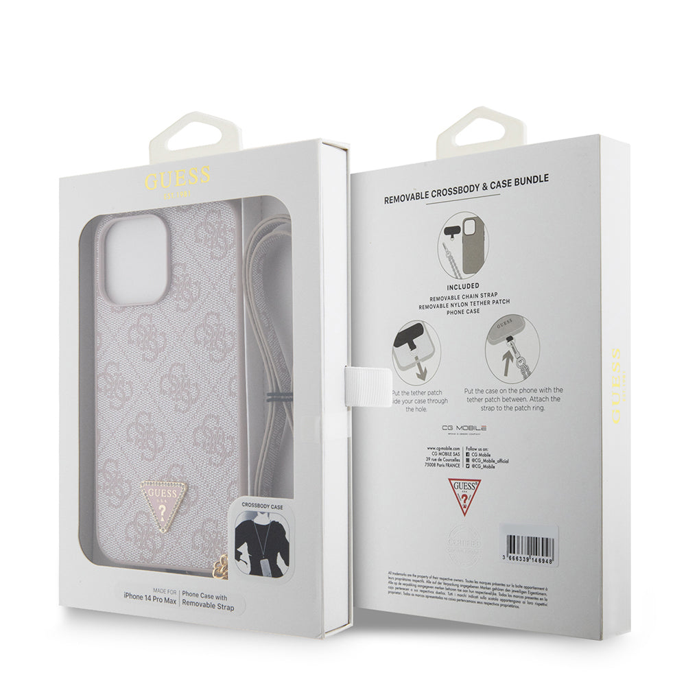 Apple iPhone 14 Pro Max Kılıf Guess Orjinal Lisanslı PU Deri Taşlı Metal Üçgen Logolu Çapraz Vücut Askılı 4G Desenli Kapak Pembe