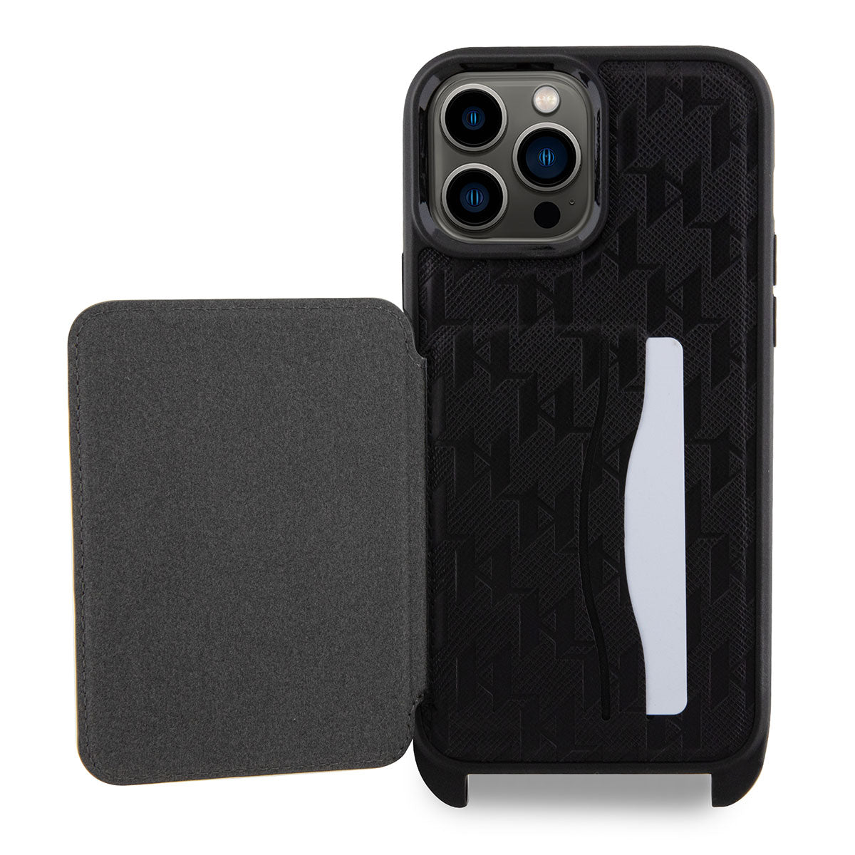 Apple iPhone 14 Pro Max Kılıf Karl Lagerfeld Boyun Askılı Kartlıklı Choupette Dizayn Kapak Siyah
