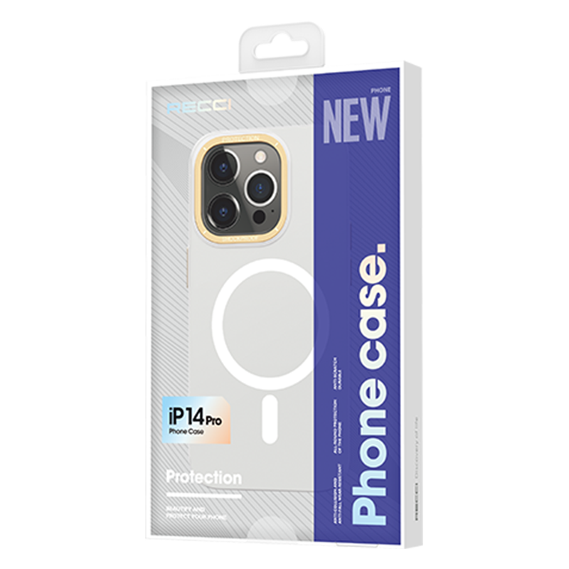 Apple iPhone 14 Pro Max Kılıf Magsafe Şarj Özellikli Metal Kamera Çerçeveli Recci Glaze Serisi Kapak Beyaz