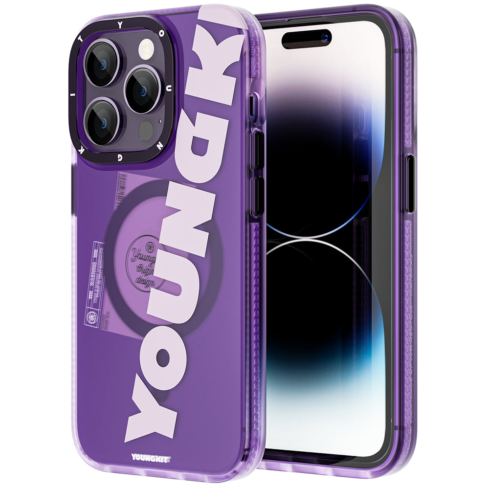 Apple iPhone 14 Pro Max Kılıf Magsafe Şarj Özellikli Youngkit Binfen Serisi Yazı Temalı Kapak Mor