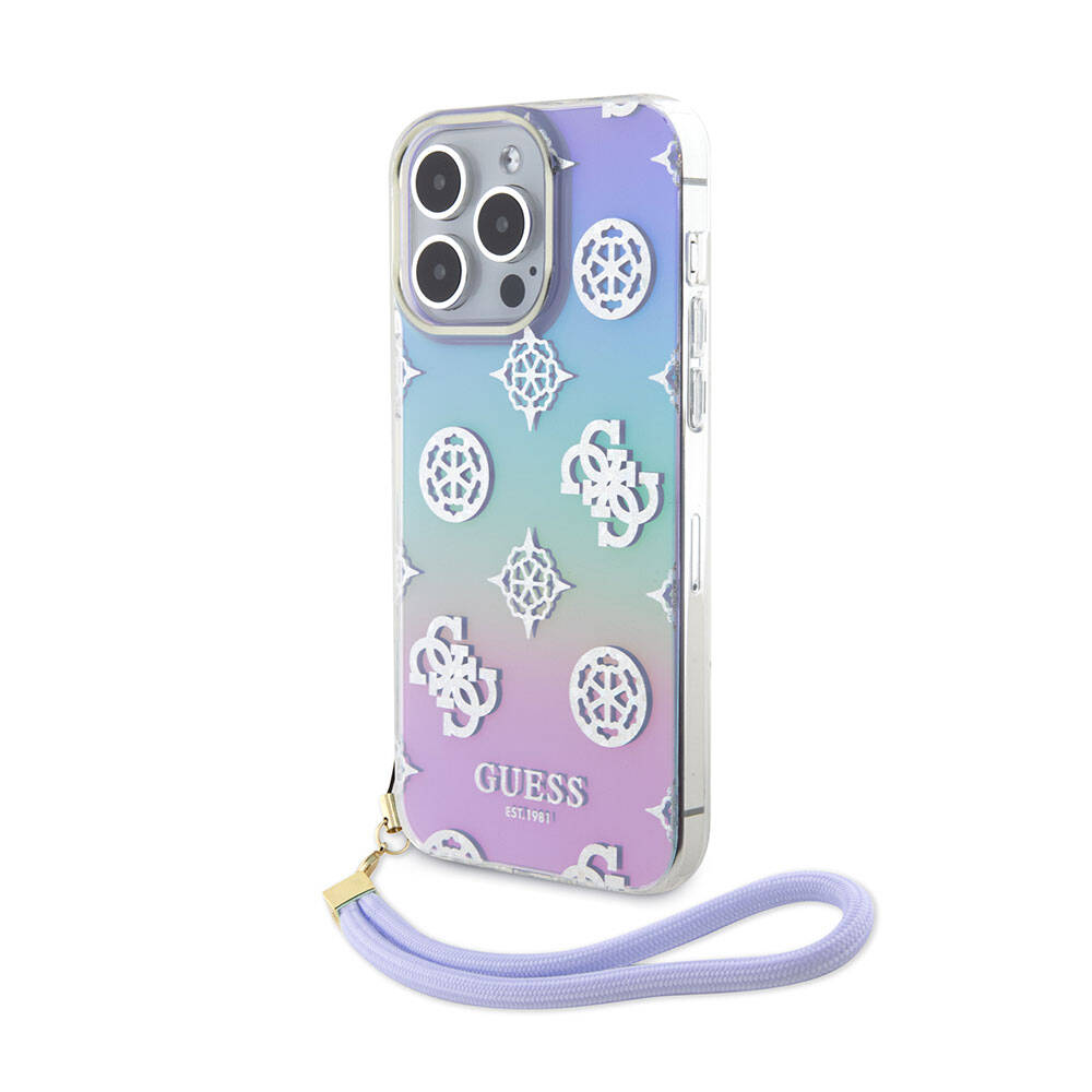 Apple iPhone 15 Pro Max Kılıf Guess Orjinal Lisanslı Desenli Yazı Logolu Askı İpli Holografik Glitter Peony Kapak