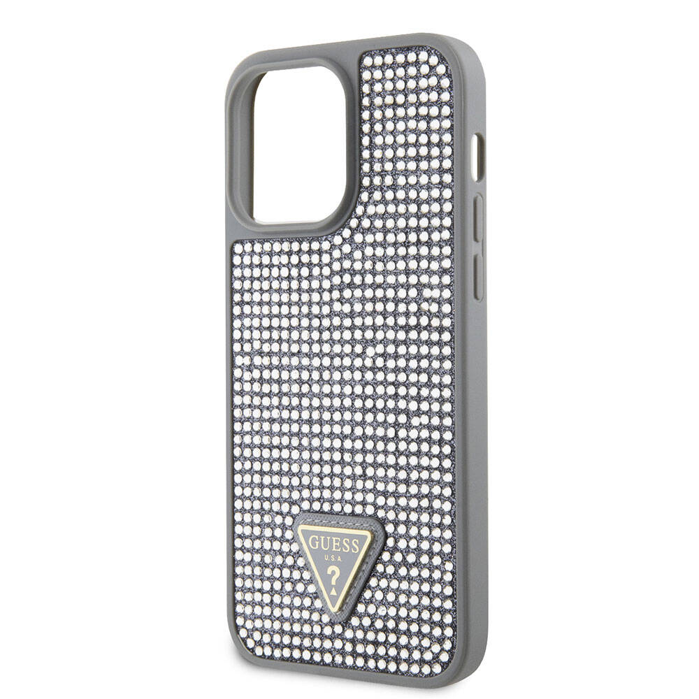 Apple iPhone 15 Pro Max Kılıf Guess Orjinal Lisanslı Taşlı Arka Yüzey Üçgen Logolu Kapak Gümüş