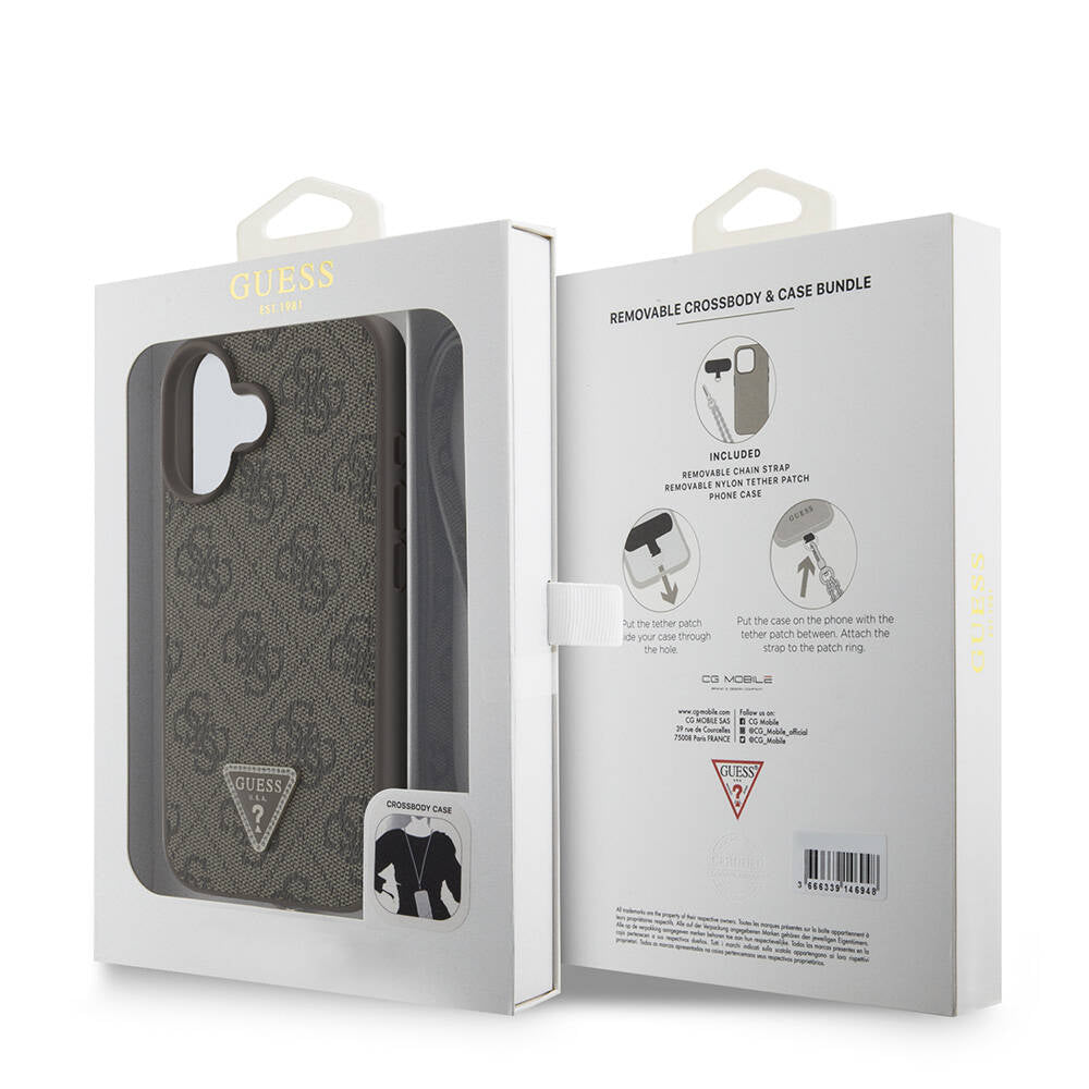 Apple iPhone 16 Kılıf Guess Orjinal Lisanslı PU Deri Taşlı Metal Üçgen Logolu Çapraz Vücut Askılı 4G Desenli Kapak Kahverengi