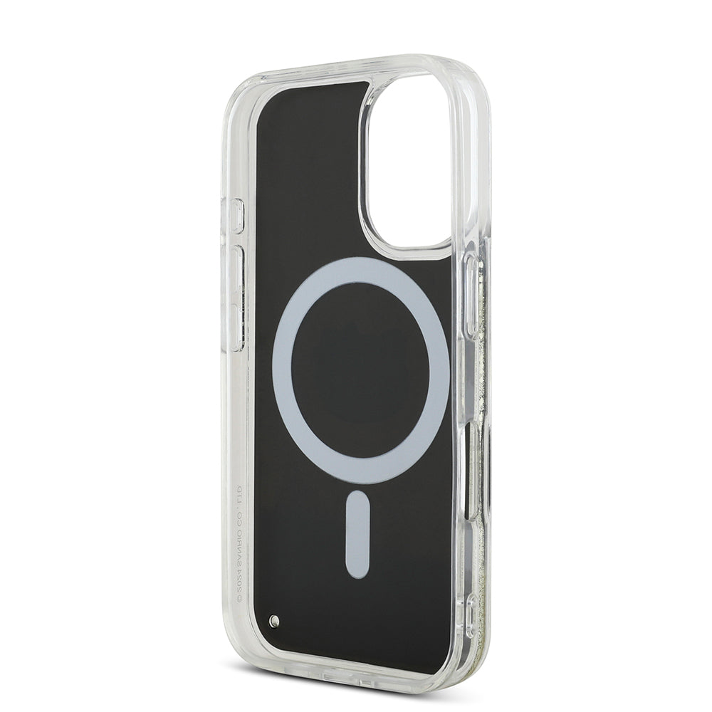 Apple iPhone 16 Kılıf Hello Kitty Orjinal Lisanslı Magsafe Şarj Özellikli IML Baskı Kitty Head Logolu Sıvılı Simli Altın Ateşi Kapak Siyah