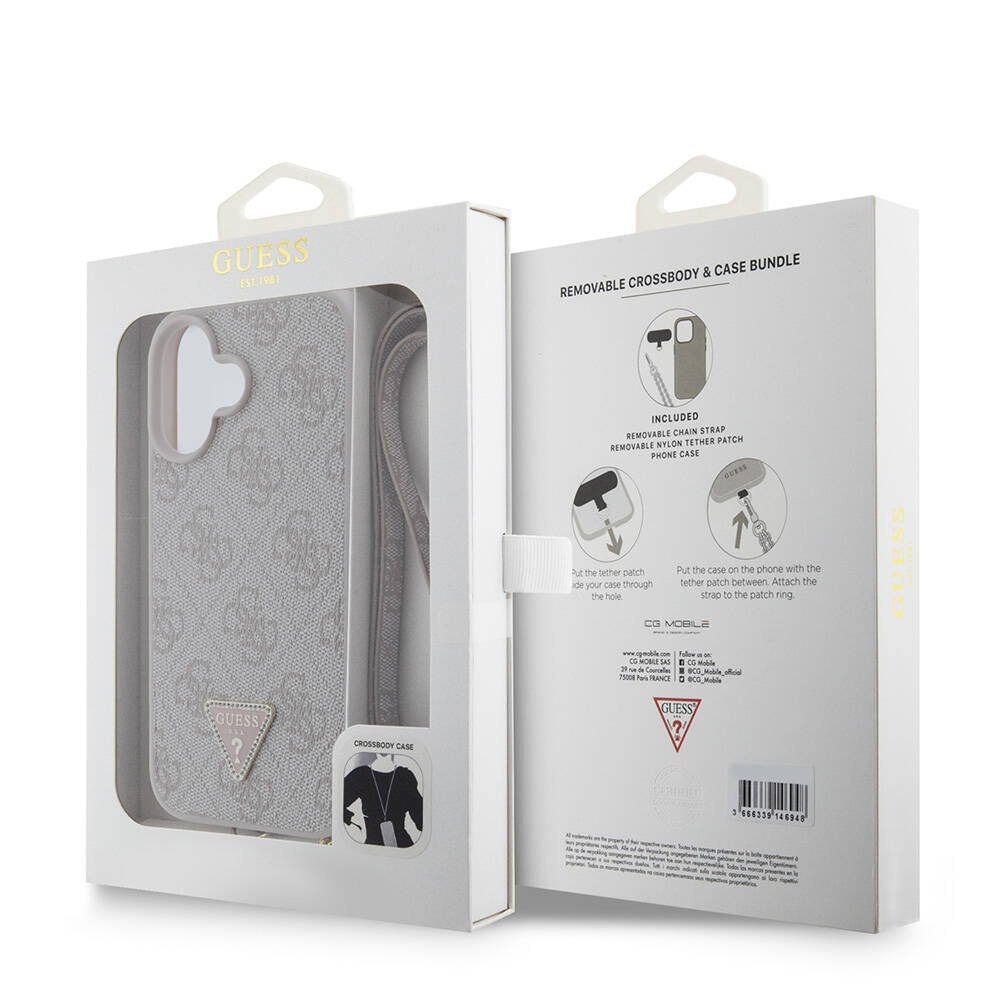iPhone 16 Plus Kılıf Guess Orjinal Lisanslı PU Deri Taşlı Metal Üçgen Logolu Çapraz Vücut Askılı 4G Desenli Kapak