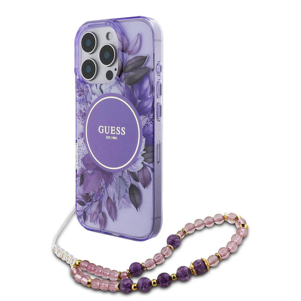 iPhone 16 Pro Kılıf Guess Orjinal Lisanslı Magsafe Şarj Özellikli IML Baskılı Çiçek İnci Bileklikli Kapak