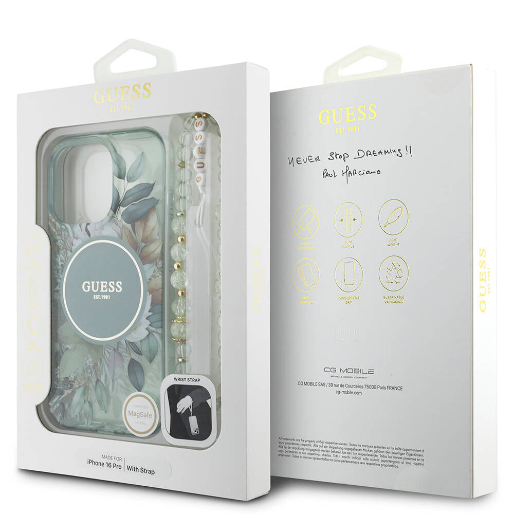 Apple iPhone 16 Pro Kılıf Guess Orjinal Lisanslı Magsafe Şarj Özellikli IML Baskılı Çiçek İnci Bileklikli Kapak Yeşil