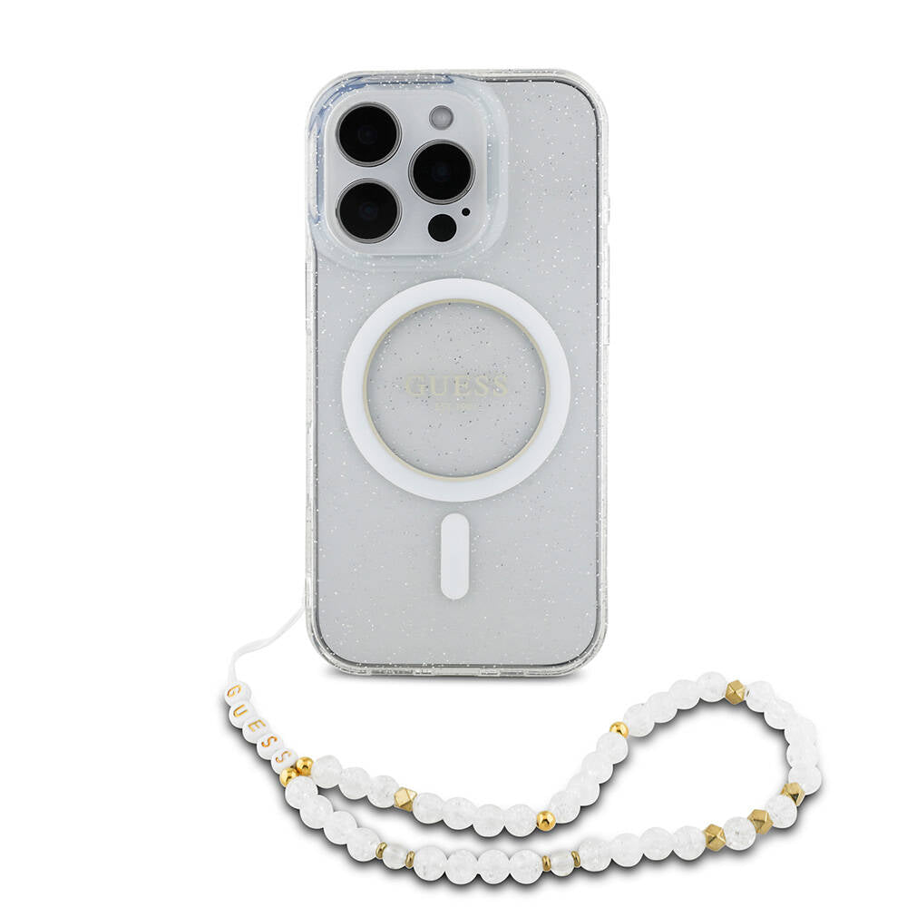 Apple iPhone 16 Pro Kılıf Guess Orjinal Lisanslı Magsafe Şarj Özellikli Simli Silikon İnci Bileklikli Kapak Şeffaf