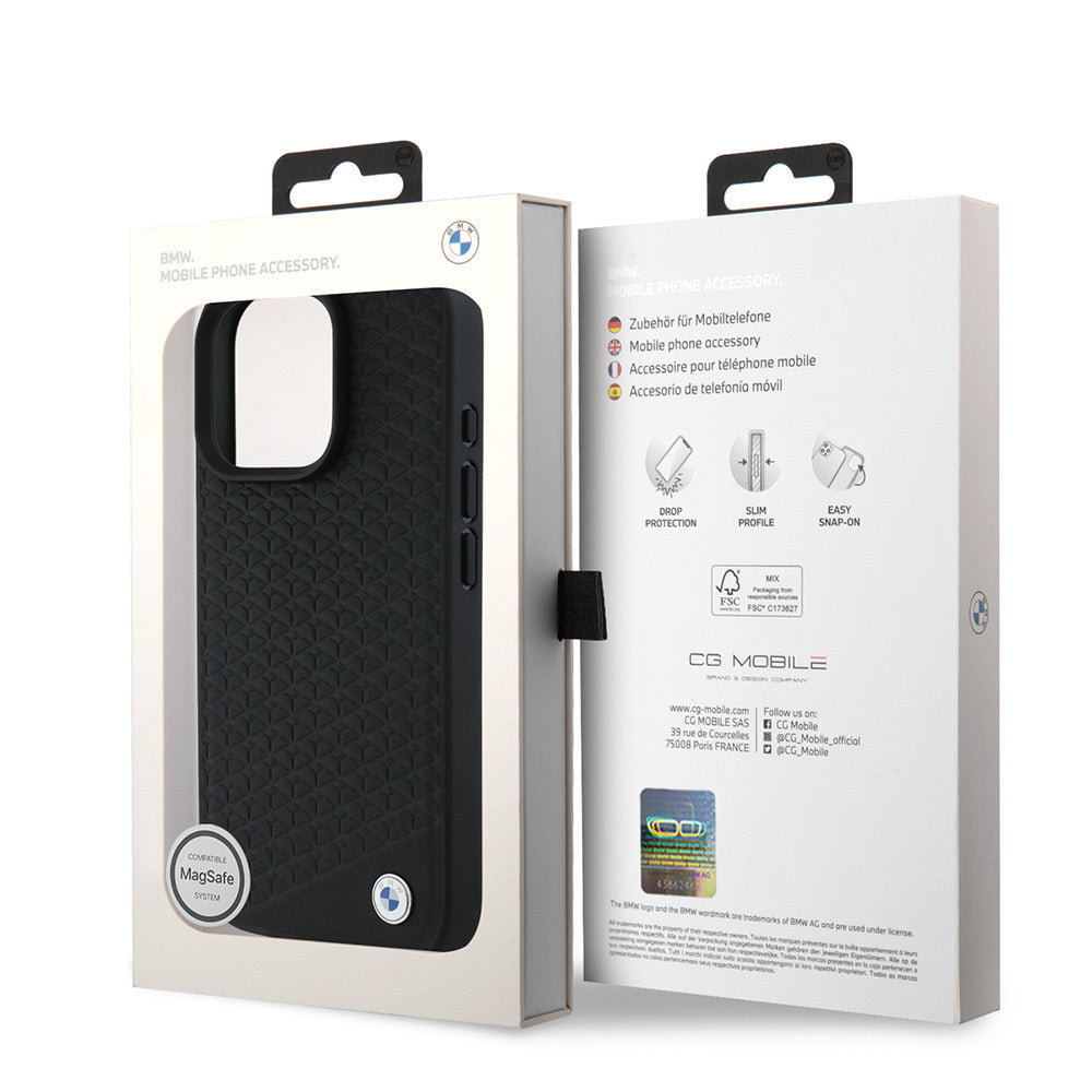 Apple iPhone 16 Pro Max Kılıf BMW Orjinal Lisanslı Magsafe Şarj Özellikli Metal Logolu Dokulu Diamond Deri Kapak Siyah