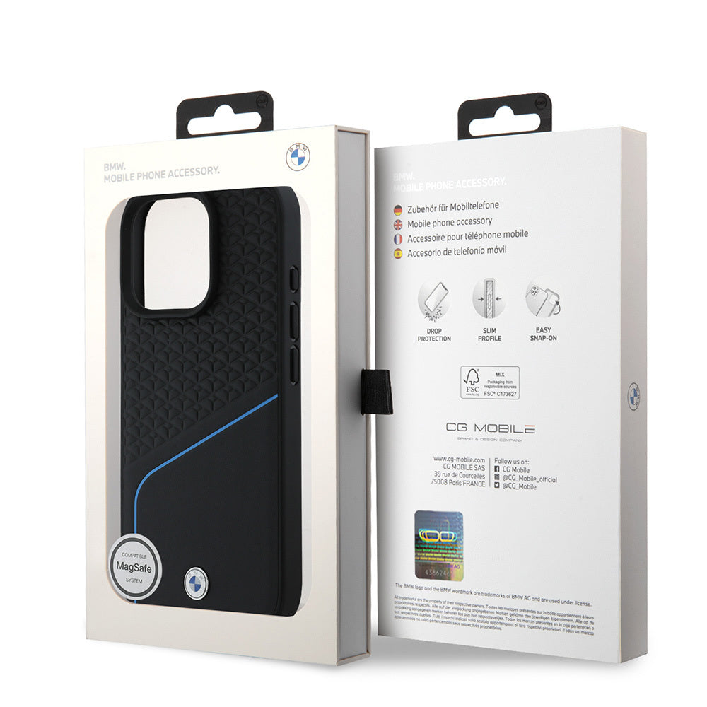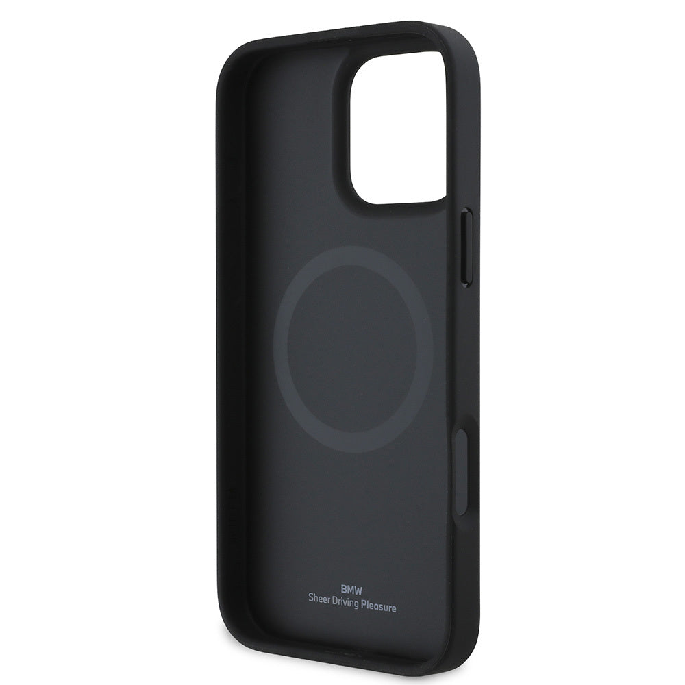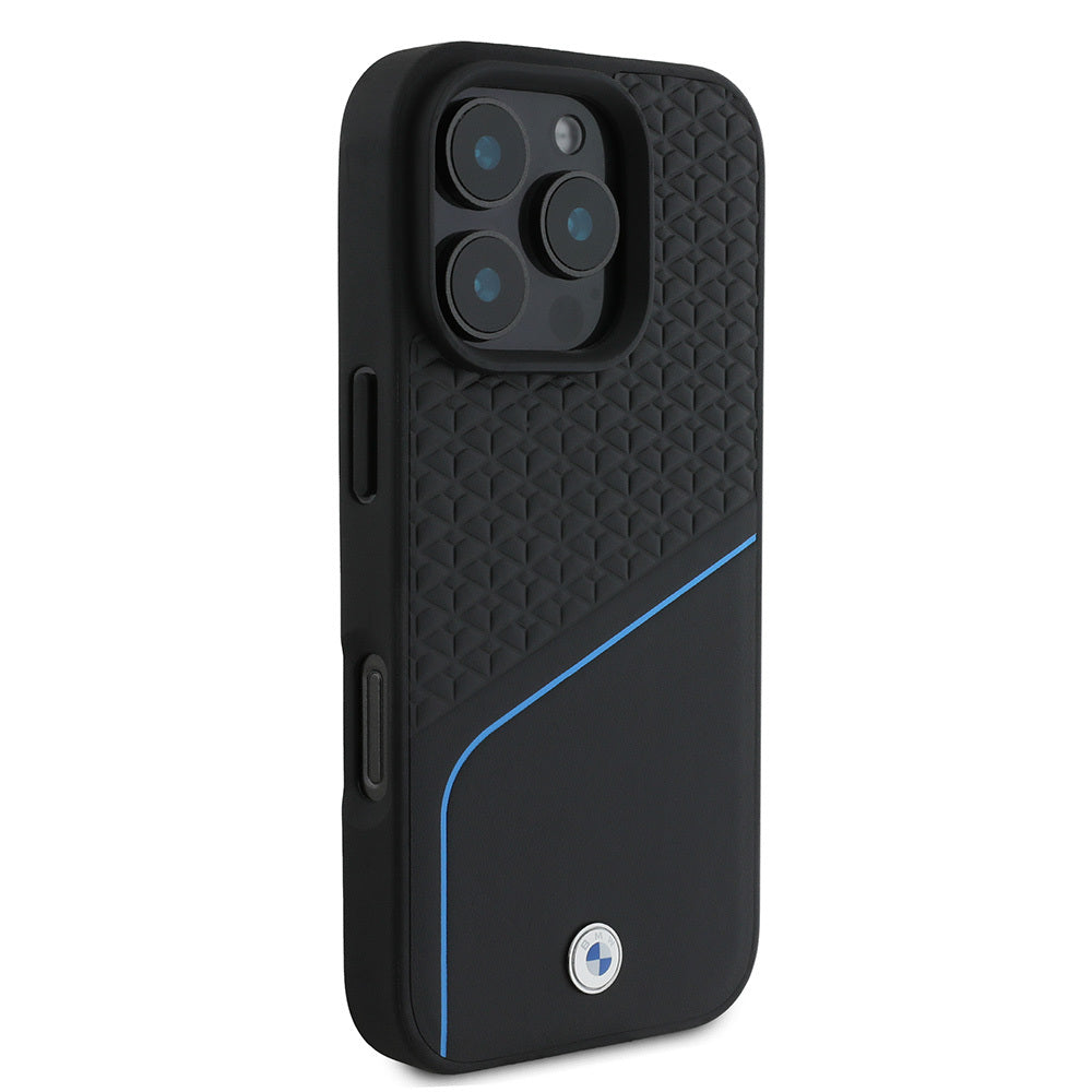 iPhone 16 Pro Max Kılıf BMW Orjinal Lisanslı Magsafe Şarj Özellikli Metal Logolu Dokulu ve Çizgili Deri Kapak