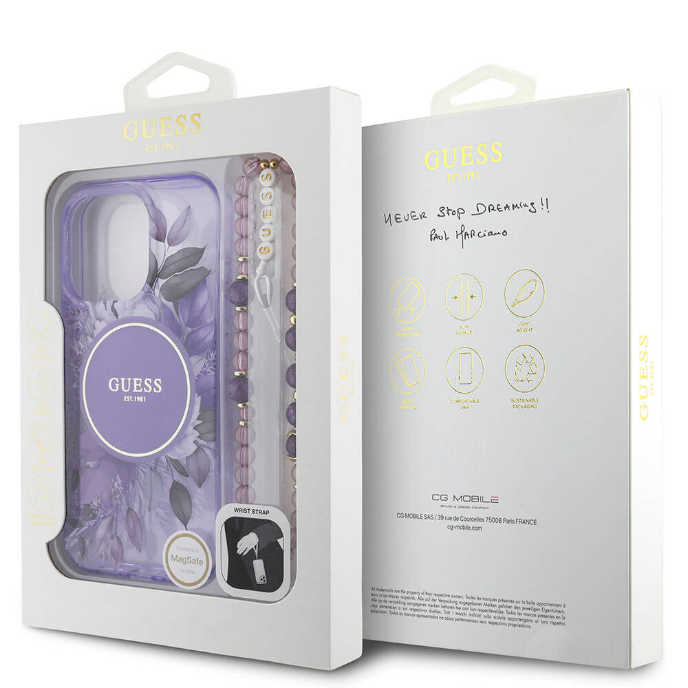 iPhone 16 Pro Max Kılıf Guess Orjinal Lisanslı Magsafe Şarj Özellikli IML Baskılı Çiçek İnci Bileklikli Kapak
