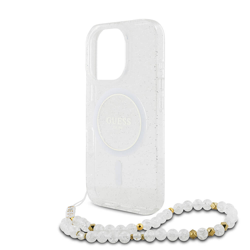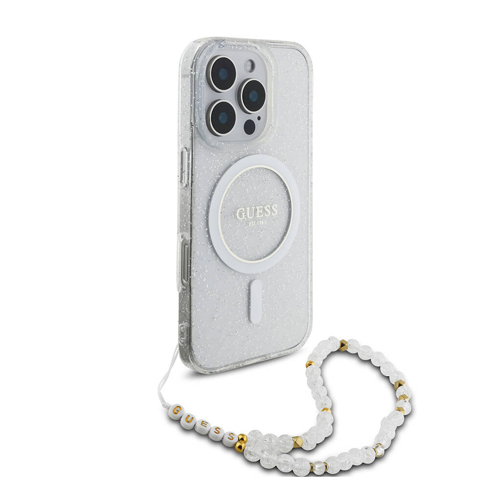 Apple iPhone 16 Pro Max Kılıf Guess Orjinal Lisanslı Magsafe Şarj Özellikli Simli Silikon İnci Bileklikli Kapak Şeffaf