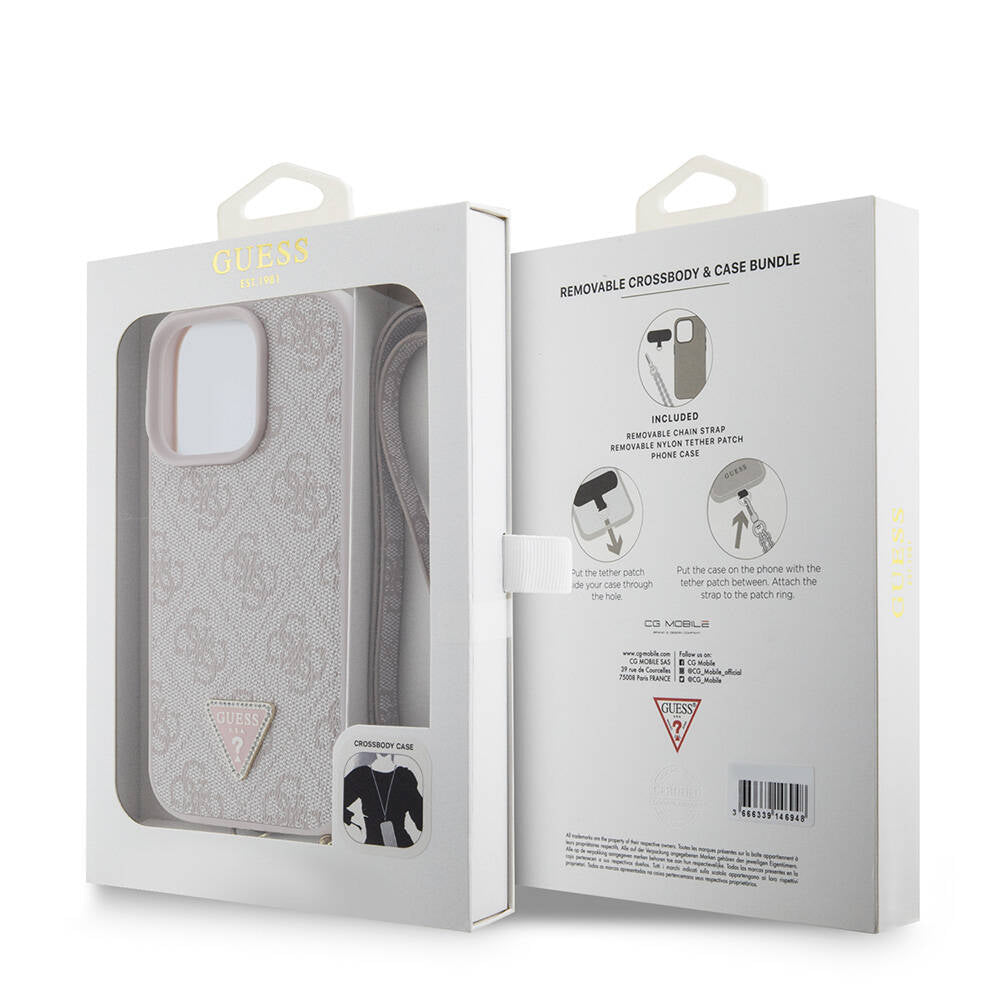 Apple iPhone 16 Pro Max Kılıf Guess Orjinal Lisanslı PU Deri Taşlı Metal Üçgen Logolu Çapraz Vücut Askılı 4G Desenli Kapak Pembe