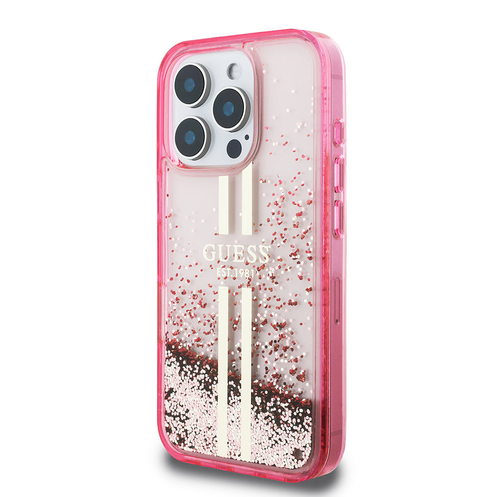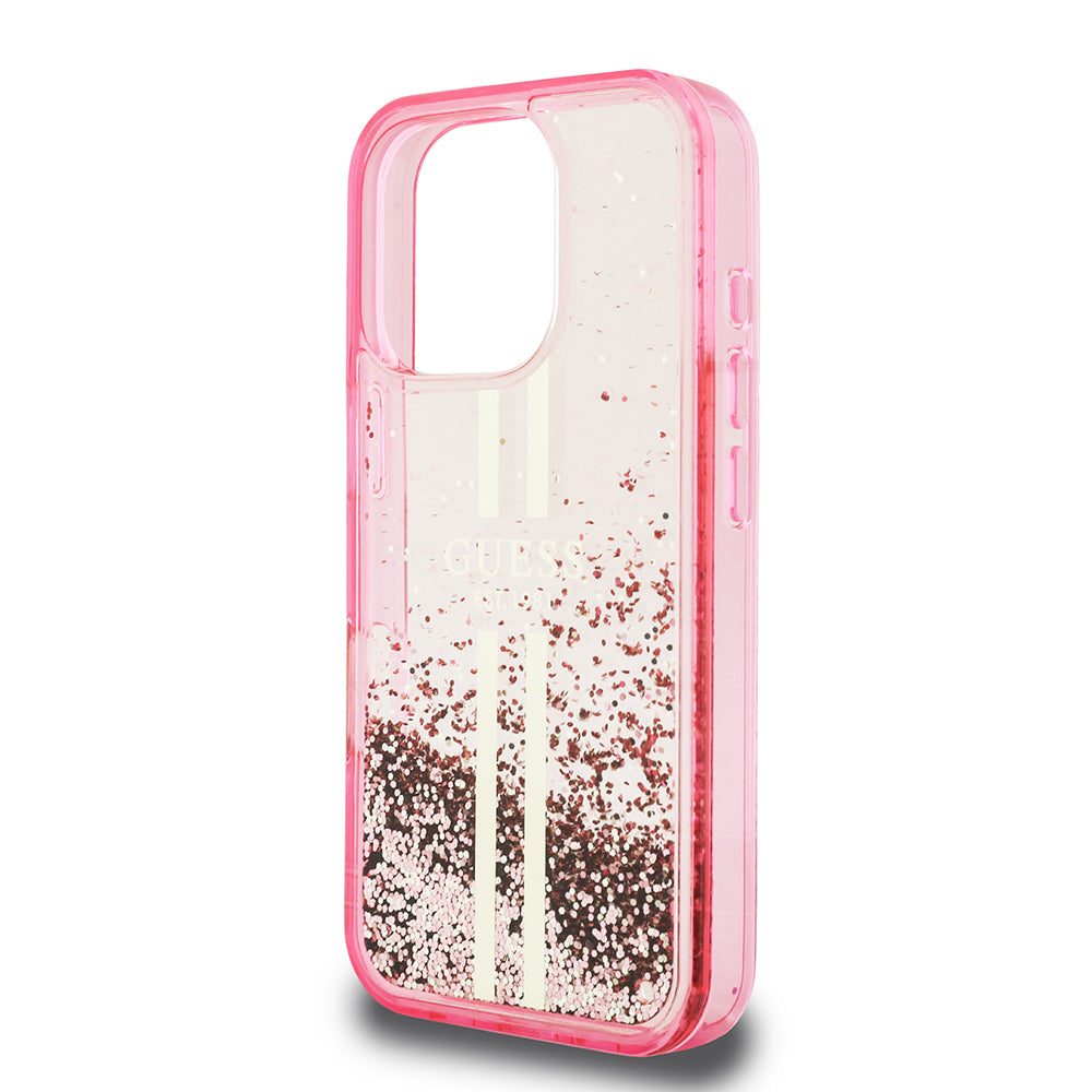 Apple iPhone 16 Pro Max Kılıf Guess Orjinal Lisanslı Transparan Sıvılı Simli Altın Çizgili Kapak Pembe
