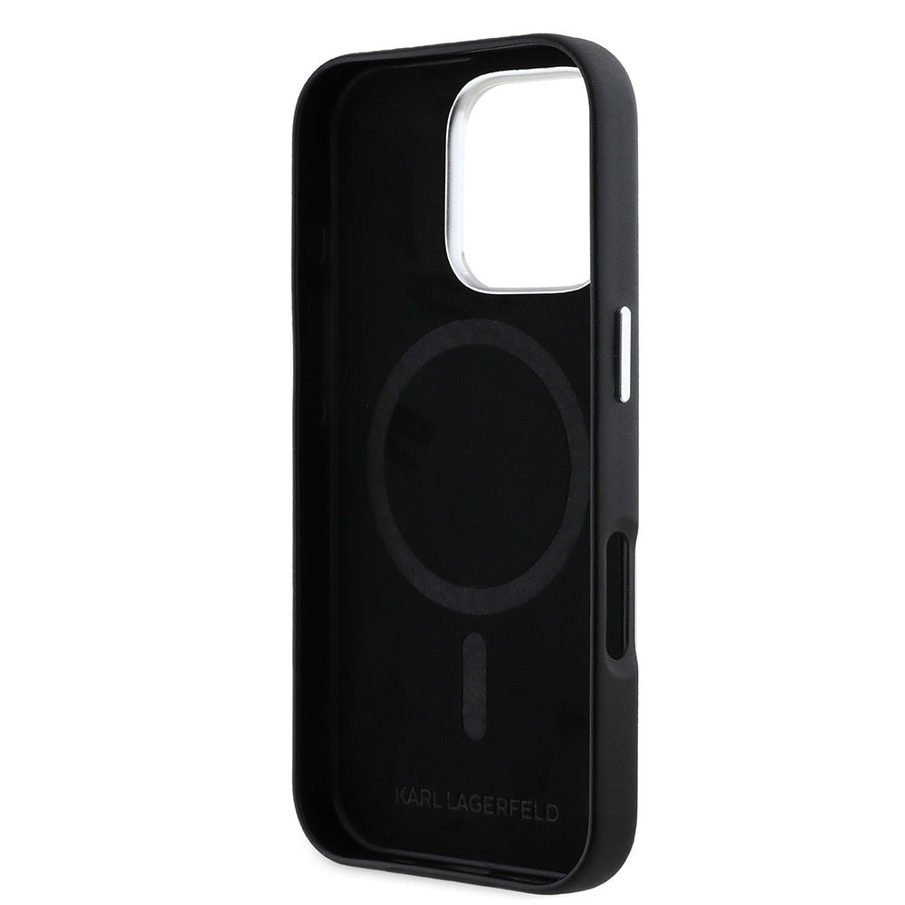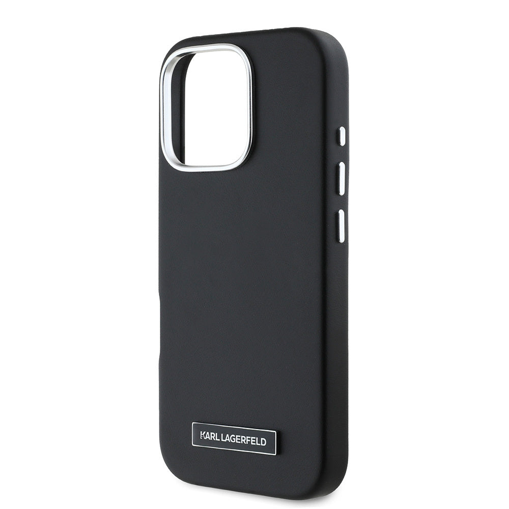 Apple iPhone 16 Pro Max Kılıf Karl Lagerfeld Orjinal Lisanslı Magsafe Şarj Özellikli Metal Kamera ve Buton Tasarımlı Plaka Logolu PU Deri Kapak Siyah