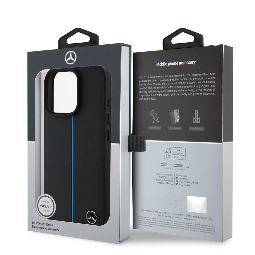 Apple iPhone 16 Pro Max Kılıf Mercedes Benz Orjinal Lisanslı Magsafe Şarj Özellikli Metal Yıldız Logolu Mavi Çizgili Deri Kapak Siyah