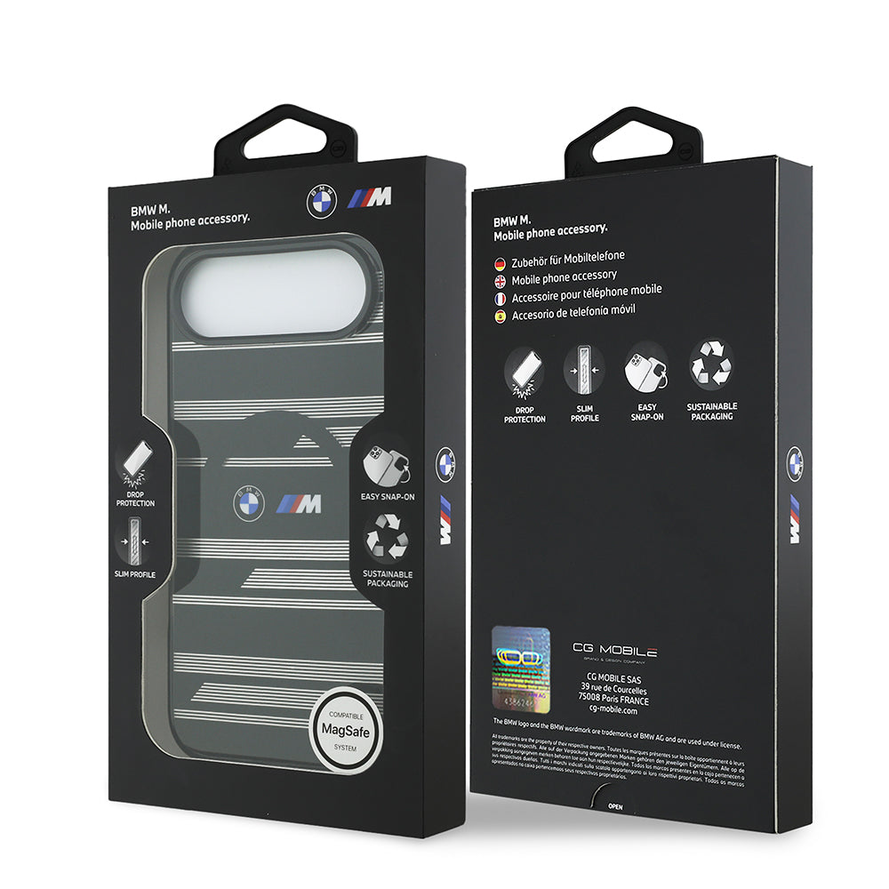 Apple iPhone 17 Air Kılıf BMW Orjinal Lisanslı M-safe Şarj Özellikli Metal Kamera Butonlu Yatay Şeritli M Dizayn Kapak Siyah