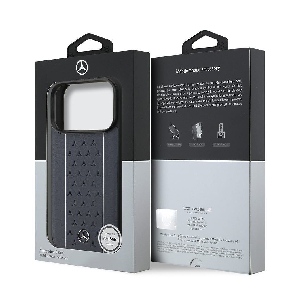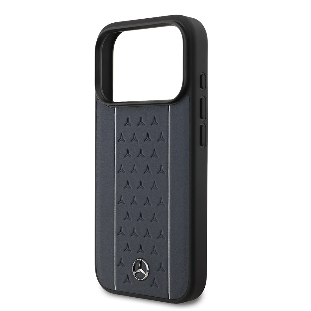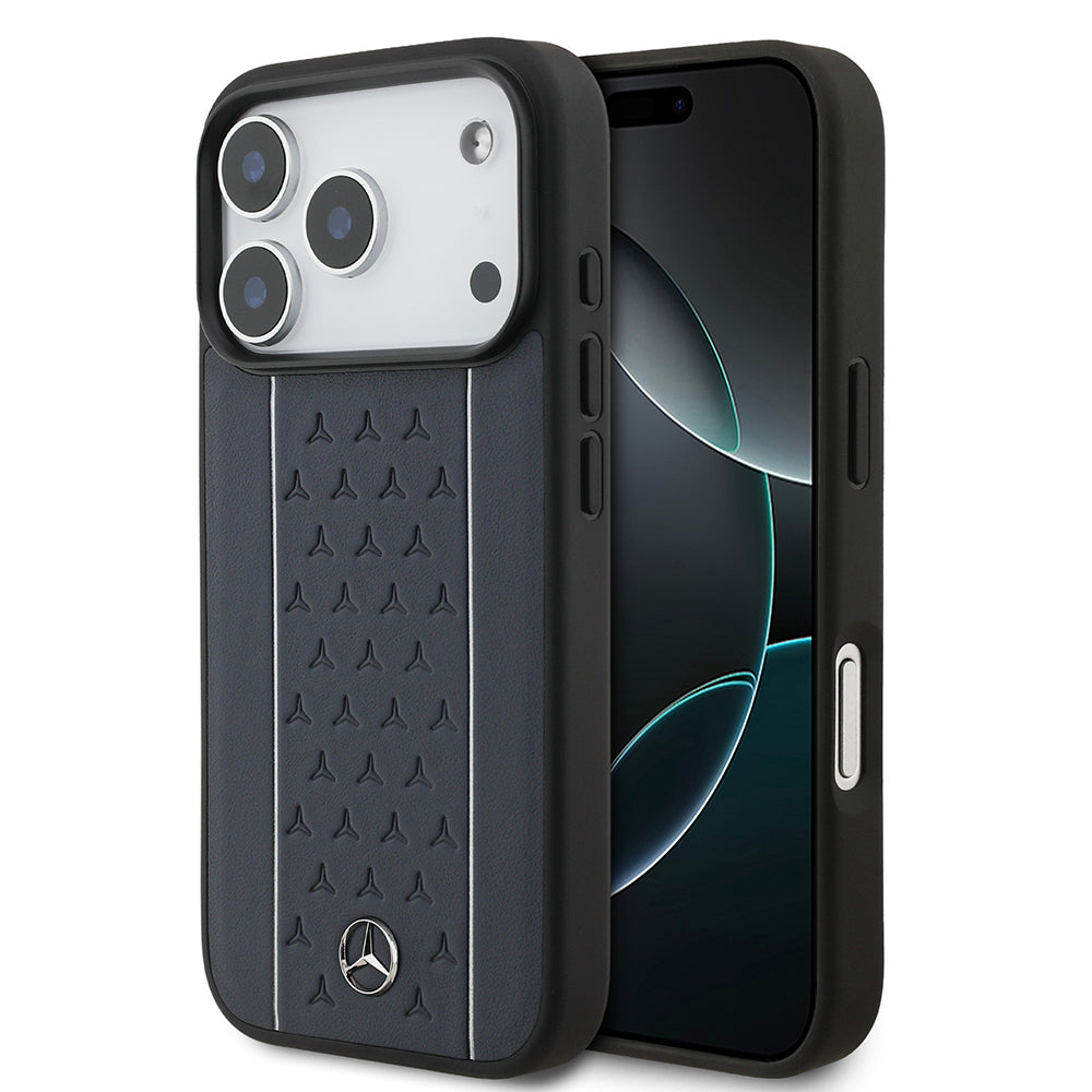Apple iPhone 17 Pro Kılıf Mercedes Benz Orjinal Lisanslı M-safe Şarj Özellikli Şeritli Yıldız Desenli Metal Logolu Deri Kapak Lacivert