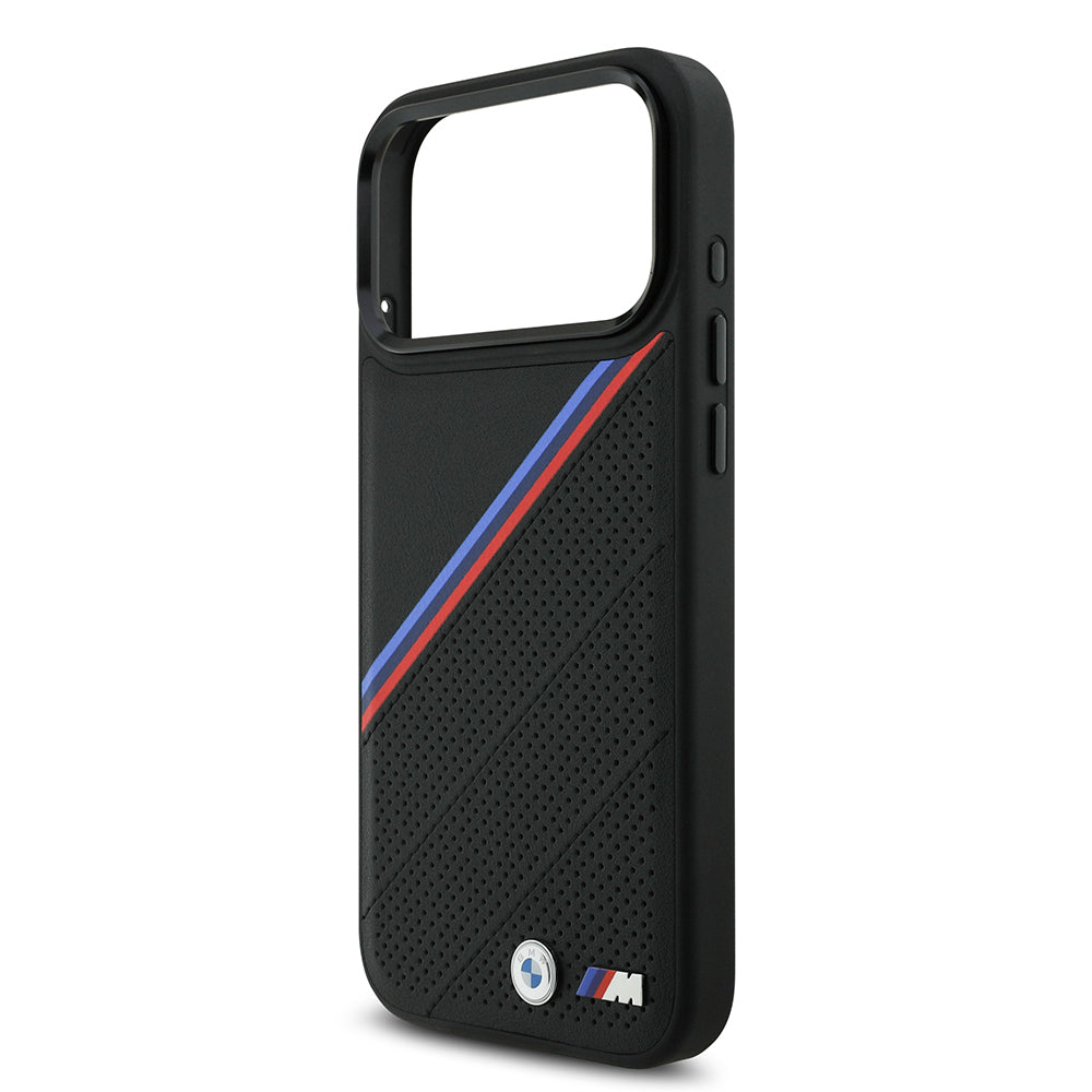Apple iPhone 17 Pro Max Kılıf BMW Orjinal Lisanslı M-safe Şarj Özellikli M Logolu Üç Şeritli Delikli Deri Kapak Siyah