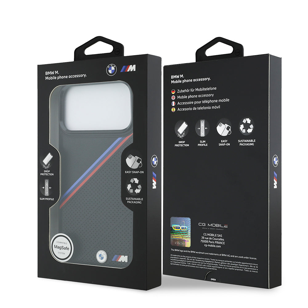 iPhone 17 Pro Max Kılıf BMW Orjinal Lisanslı M-safe Şarj Özellikli M Logolu Üç Şeritli Delikli Deri Kapak