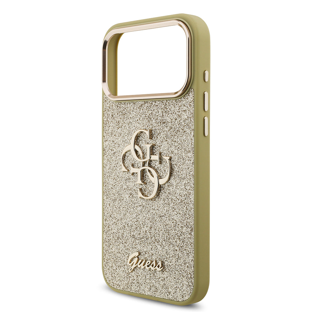 Apple iPhone 17 Pro Max Kılıf Guess Orjinal Lisanslı 4G Büyük Metal Kamera Çerçeveli ve Logolu Glitter Kapak Gold