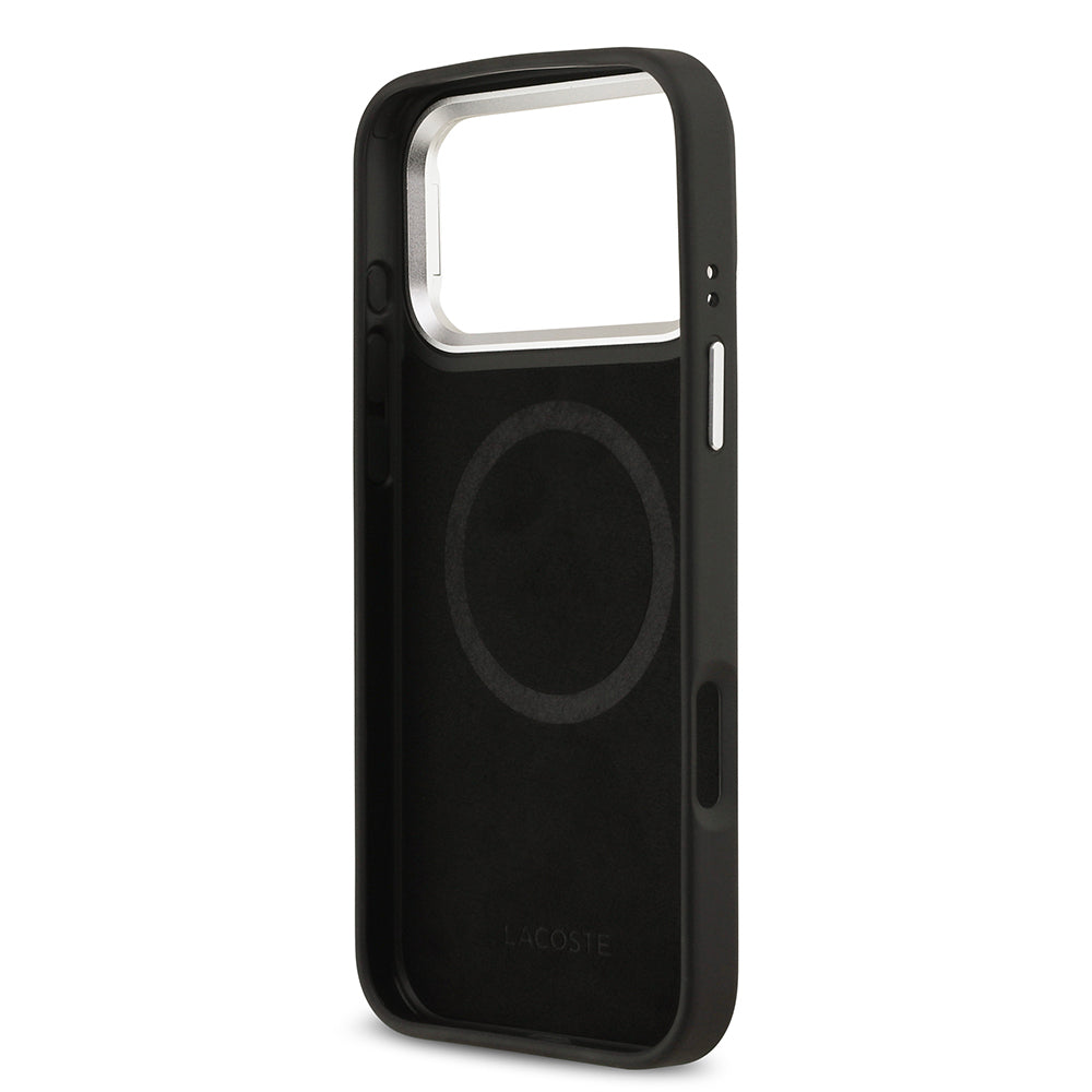 iPhone 17 Pro Max Kılıf Lacoste Orjinal Lisanslı M-safe Şarj Özellikli PU Pike Desenli Standlı Metal Logolu Kapak