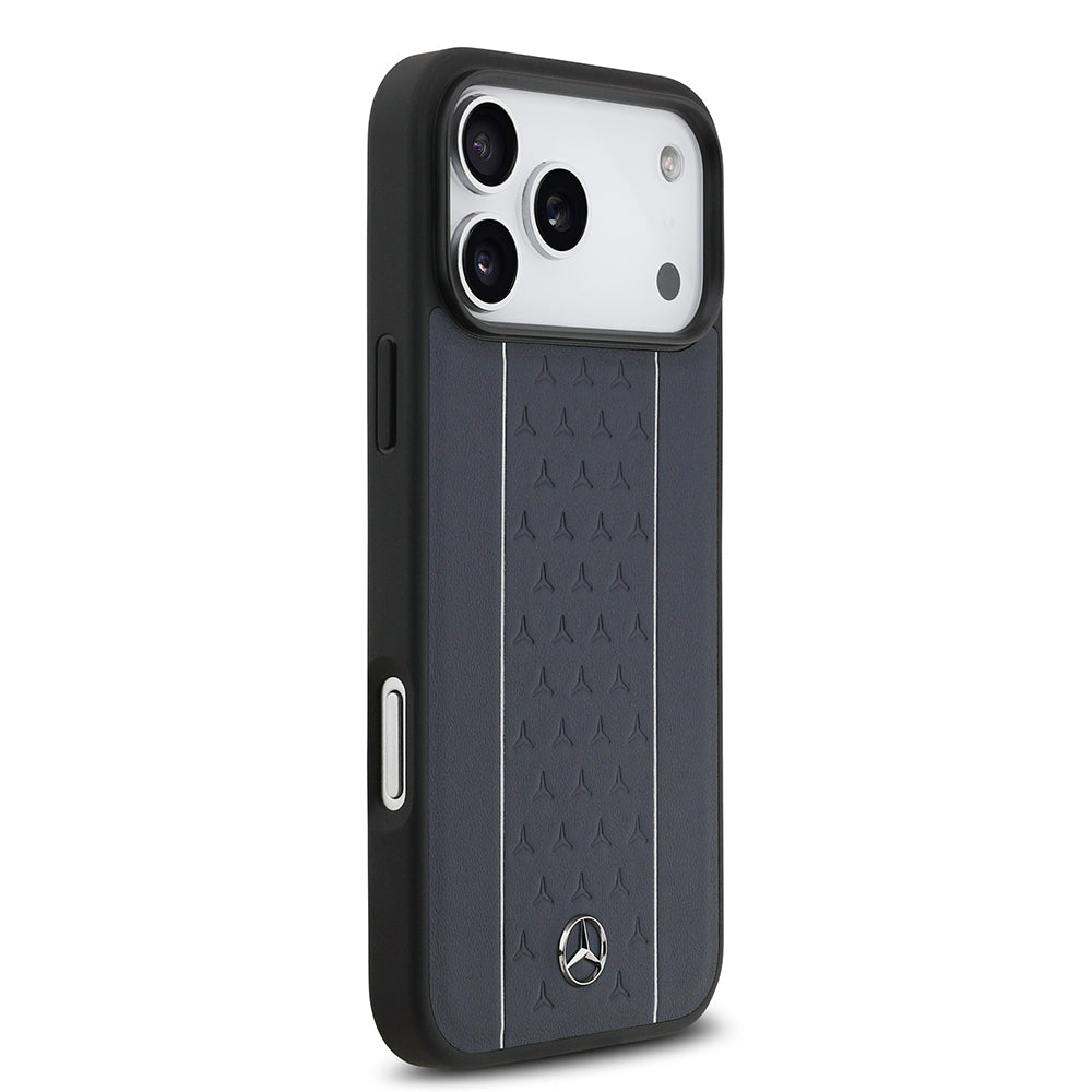 Apple iPhone 17 Pro Max Kılıf Mercedes Benz Orjinal Lisanslı M-safe Şarj Özellikli Şeritli Yıldız Desenli Metal Logolu Deri Kapak Lacivert