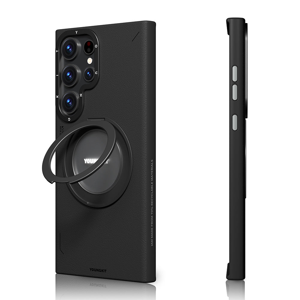 Galaxy S23 Ultra Kılıf M-safe Şarj Özellikli 360° Standlı Basit Mat Deri Desenli Youngkit Tech Leather Serisi Kapak Siyah