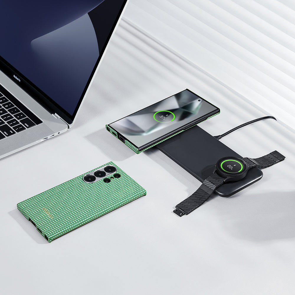 Galaxy S24 Ultra Kılıf Magsafe Şarj Özellikli 1500D Aramid Fiber Pitaka Ultra-Slim Classic Serisi Aomori Kapak Yeşil