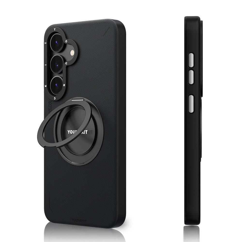 Galaxy S25 Kılıf M-safe Şarj Özellikli 360° Standlı Basit Mat Deri Desenli Youngkit Tech Leather Serisi Kapak Siyah