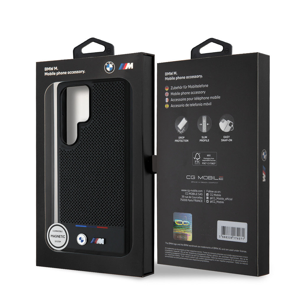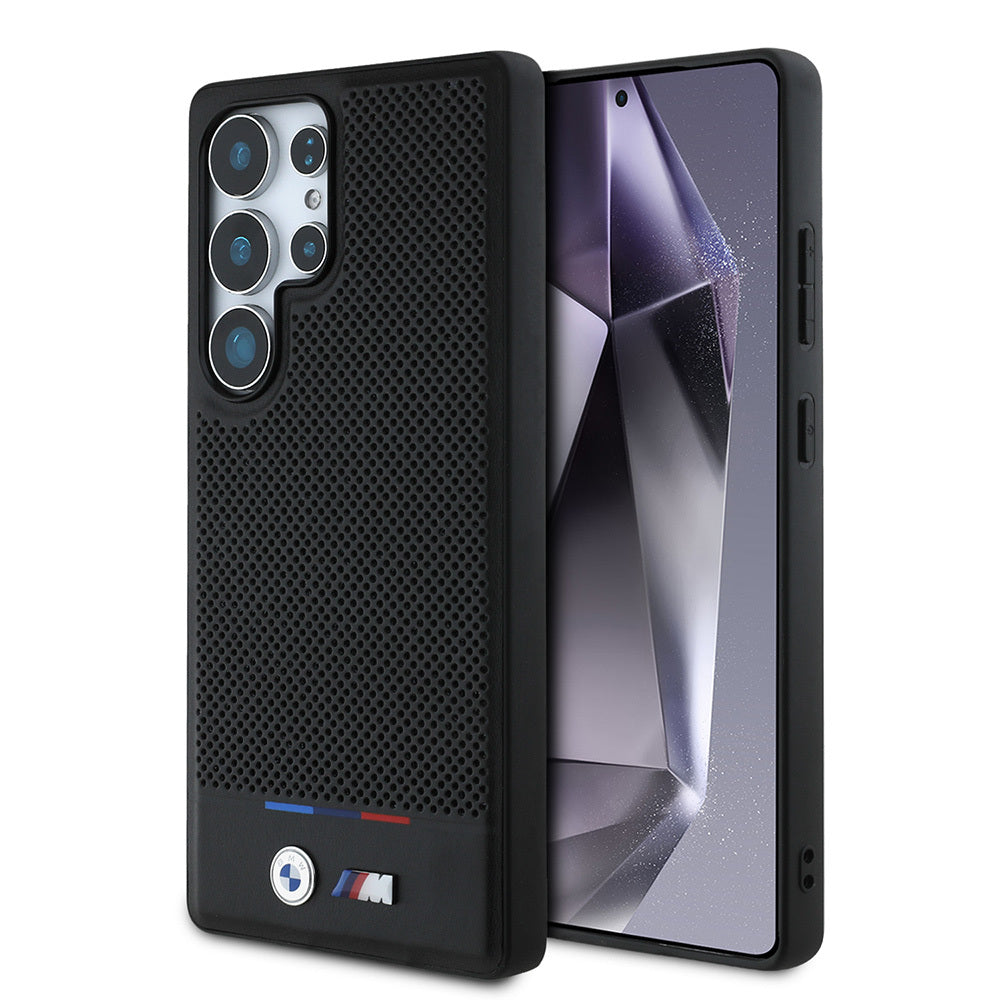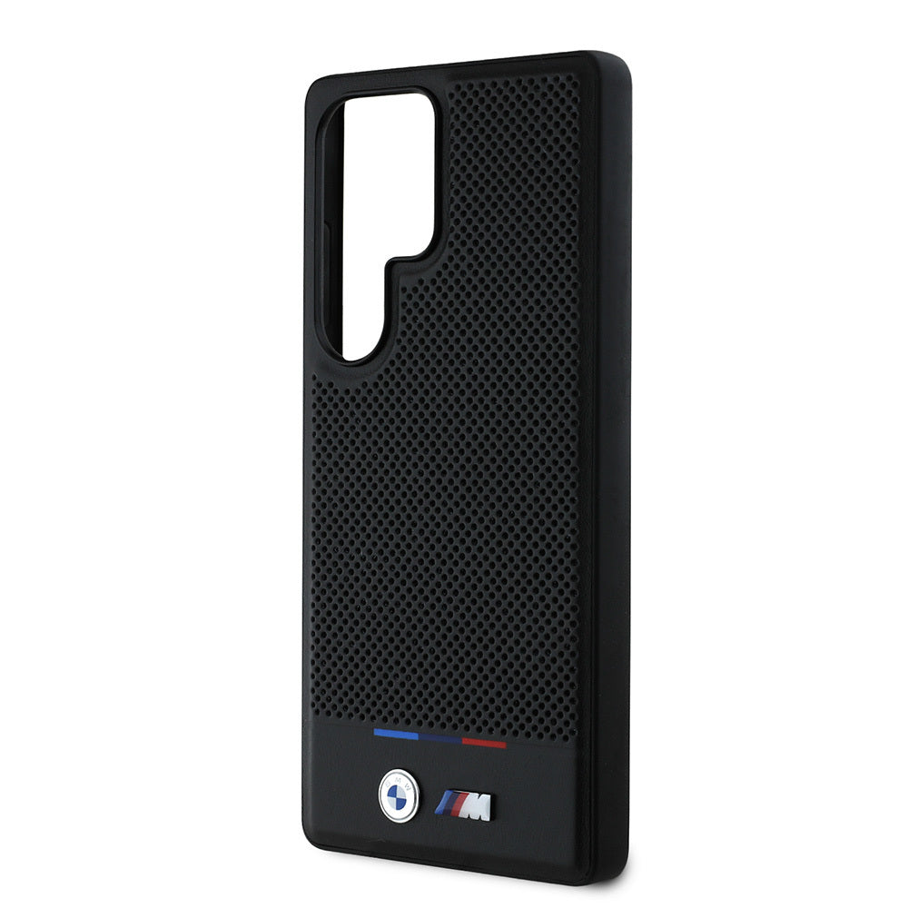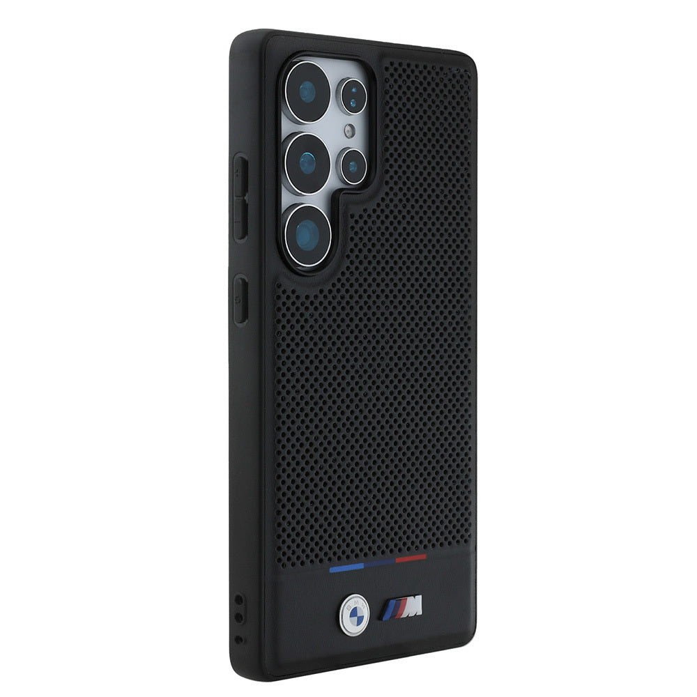 Galaxy S25 Ultra Kılıf BMW Orjinal Lisanslı M-safe Şarj Özellikli M Logolu Bottom Üç Çizgili Delikli PU Deri Kapak Siyah