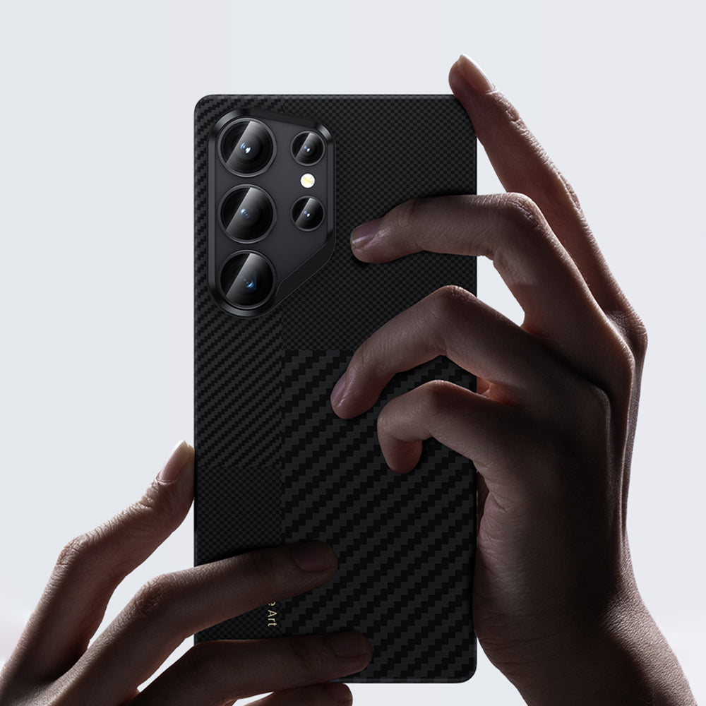 Kenarları ve arka yüzeyi birbirinden farklı karbon fiber desenlerinden oluşan şık bir tasarıma sahip olduğu gibi, aynı zamanda dayanıklı bir dış yüzeye sahiptir.